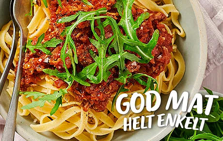 GOD MAT HELT ENKELT Köttfärssås med tomatpesto Det ska vara enkelt att upptäcka och variera middagsfavoriten. Vi hjälper dig på vägen! Till God Mat Helt enkelt